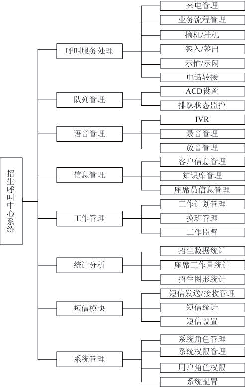 招生呼叫中心中心系統包括考生信息管理,生源的追蹤與管理,自助語音導航(IVR)、知識庫系統和短信收集和發送等功能模塊。招生呼叫系統功能模塊可由以下結構層次組成。